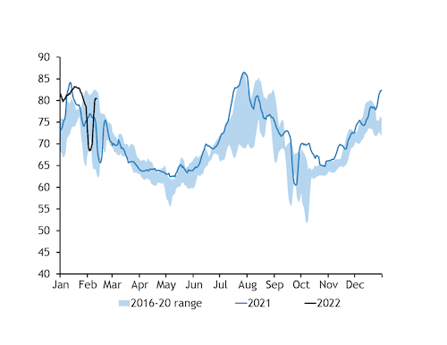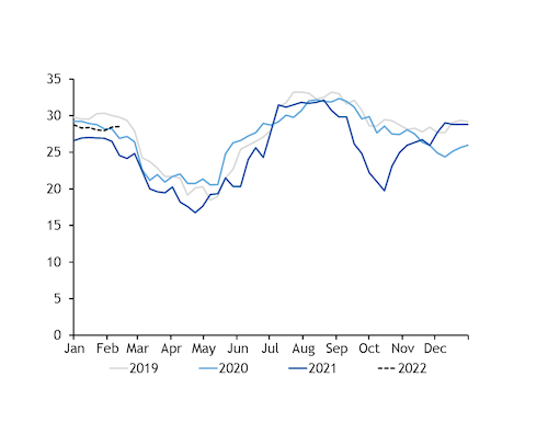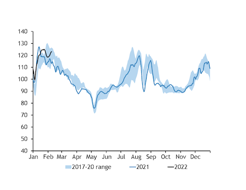 Lower nuclear availability will continue to support demand for fossil fuels, especially coal, with fuel-switching economics heavily favouring the solid fuel in Japan. But fuel availability remains tight in Japan, and cold weather forecasts have also spurred gas demand for March-April delivery, supporting regional spot LNG prices.