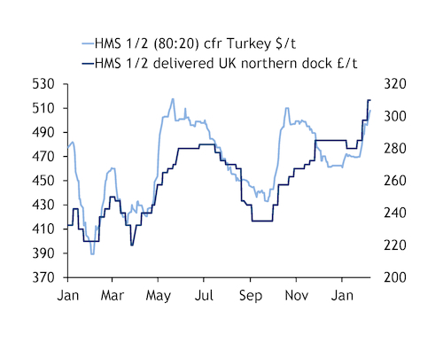 A renewed uptick in the Turkish ferrous scrap import price past $500/t has been the main short-term driver for this UK dock increase. The Argus daily HMS 1/2 80:20 cfr Turkey assessment was at $508/t on Friday.