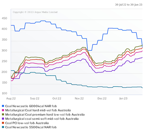 Argus last assessed high-grade 6,000 kcal/kg NAR thermal coal at $319.23/t fob Newcastle on 27 January, down from $410.17/t on 9 December 2022 and from a peak of $444.59/t fob on 9 September 2022. It assessed low-grade 5,500 kcal/kg NAR thermal coal at $131.49/t fob Newcastle on 27 January, down from $133.39/t on 9 December and from $199.12/t fob on 9 September.