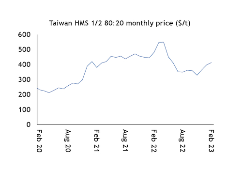 The Argus cfr Taiwan containerised HMS 1/2 80:20 index kicked off March on a firm footing. The index rose by $8/t from the previous day to $418/t on 1 March as high import demand for scrap in Turkey bolstered sentiment, which rippled into Asia. This prompted suppliers to keep a watchful eye on arbitrage opportunities as demand for ferrous scrap in South Asia also rose.