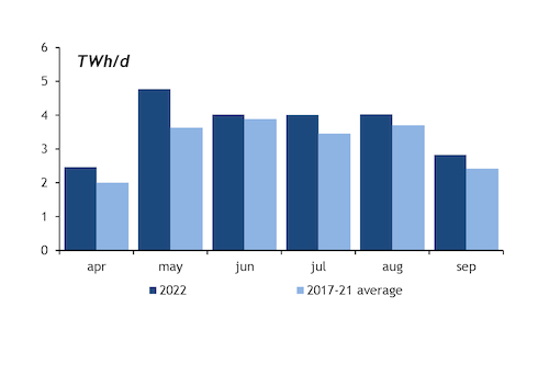 Injection demand last year was boosted by the German government's purchase of roughly 50TWh of gas through THE, the country's market area manager. Net injections in Germany averaged 861 GWh/d in summer last year, 42pc higher than the five-year average for the season, while EU-wide injections were 14pc higher than the five-year average.