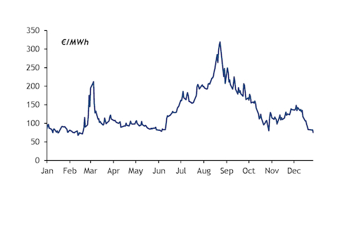 Gas prices at European hubs rose sharply in February last year after the beginning of the Russia-Ukraine conflict, and again from mid-June, peaking in late August before falling in the fourth quarter of the year (see TTF graph).