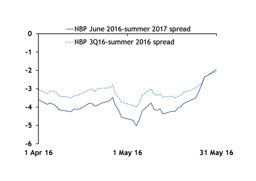 The June 2016 contract was as much as 5p/th below the summer 2017 market in early May last year, although the spread tightened towards the end of the month.