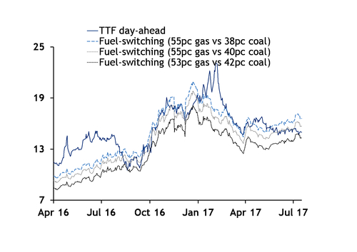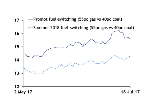 But the coal curve's backwardation — with prompt prices higher than forward prices — has lifted prompt fuel-switching prices, assuming a 55pc-efficient gas-fired plant and 40pc-efficient coal-fired unit — above the summer 2018 equivalent.