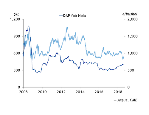 The US phosphate and row crop markets have been on diverging paths since 29 May, when escalating trade tensions between the US and China sent crop prices tumbling but the unexpected strength of Mosaic's summer-fill program shortened already thin phosphate supplies. Since then, expected returns from the 2018 crop have been in decline, with corn prices falling by 16pc to $3.56/bushel and soybeans have fallen 21pc to a 10-year low of $8.34/bushel as of 28 August.