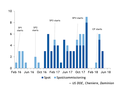 According to the DOE data, 19 of the Sabine Pass spot exports were test cargoes for the first four liquefaction trains at the facility. Many of the remaining spot cargoes were available because of the lag between a train's being commissioned and the start of long-term offtake contracts. There were 26 spot or commissioning cargoes sold in September-December 2017 following the start of Sabine Pass train 4. Some of these may have been in advance of Indian firm Gail's long-term offtake for 3.5mn t/yr, which started in March (see table).