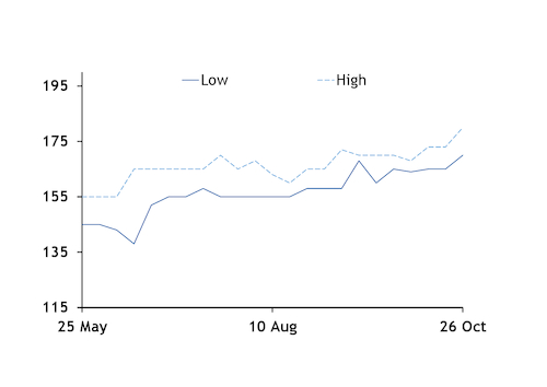 The weaker outlook has been counterbalanced lately, with ticket demand and prices supported by logistical disruptions for blenders. Low water levels on the Rhine have inhibited the flow of fuels barges into Germany. Fuel suppliers in the Amsterdam-Rotterdam-Antwerp (ARA) region have struggled to meet German demand through the rail network, as it lacks the capacity to replace the barge system.