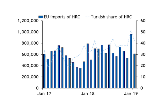 Turkish producers normally sell HRC for shipment two months in advance — for example, in April they sell June shipment material. Uncertainty about the definitive EU safeguard quotas at the end of 2018 slowed HRC sales to the EU, which was reflected in lower February imports, but customs data suggest that more than 700,000t of HRC was cleared to enter the EU in March.