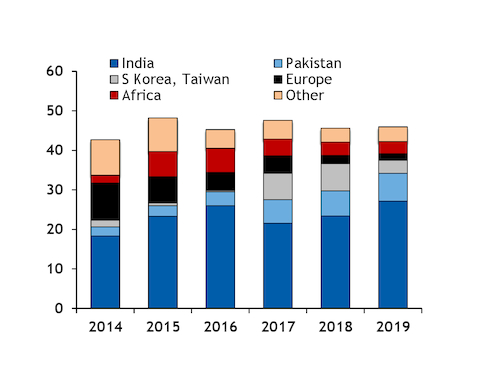 RBCT exports to south Asia crept higher last month with 2.76mn t sailing for India and 953,400t for Pakistan, up by 254,900t and 20,800t from August 2018, respectively.