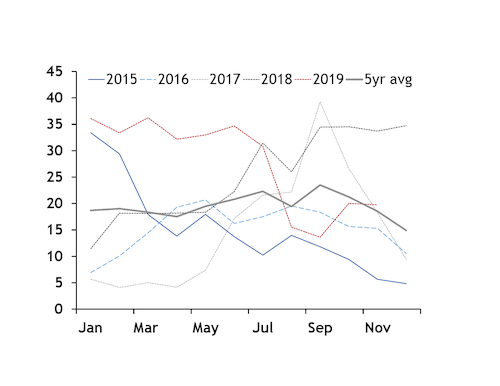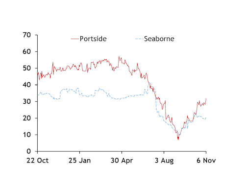 The Argus 62pc iron ore lump premium at 20.2¢/dmtu cfr Qingdao yesterday is more than double the recent low of 9.6¢/dmtu in early September. North China mills increase use of direct-charge iron ores in winter including lump and pellet. Winter pollution policies also increase demand from mid-November to mid-March, although a relaxation of these policies is limiting the demand increase for lump by allowing more sintering to remain on line. The lump premium is slightly higher than the five-year average of 18.53¢/dmtu for November but well below the 33.7¢/dmtu average in November 2019.