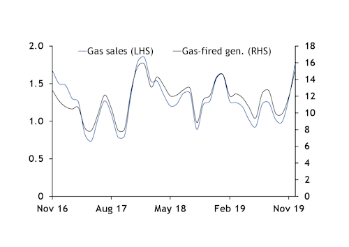 State-run supplier Kogas reported sales to the power sector of 1.77mn t last month, up from 1.57mn t in December 2018, implying overall gas-fired generation of 20.3GW, based on the historic correlation between Kogas sales and national gas burn. This would be up from 19.2GW in December 2018.