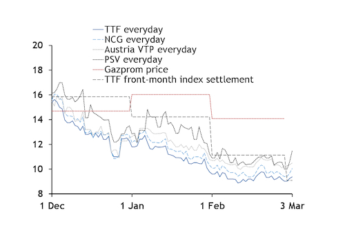Gazprom's sales fell on the year as most European prompt prices mostly held well below the TTF front-month index's settlement for February of €11.13/MWh over most of the month, which may have discouraged imports by firms with contracts linked to the index (see prompt prices graph).