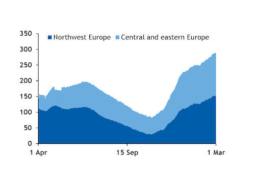 Stocks in central and eastern Europe also retained a large surplus to previous years. Combined Austrian, Czech, Slovak, Hungarian, Polish and Romanian stocks were 254TWh yesterday, up from the three-year average of 116TWh and a record high (see central and eastern European stocks graph). The 137TWh stock surplus was out from 123TWh on 1 February and 55.8TWh at the start of the winter.