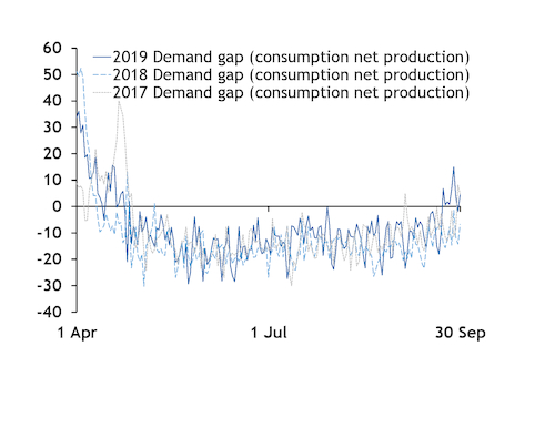 Any curtailments to offtake could increase Ukraine's need for imports compared with recent years, although there would also be scope for the stockbuild to slow in coming months, especially as inventories are well above recent-year averages.
