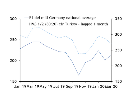 For example, the Argus monthly national average assessment for E1 ferrous scrap delivered to mill in Germany has a 90pc correlation with the monthly average of the Argus daily cfr Turkey premium HMS 1/2 80:20 assessment in the past 15 months. The latter is adjusted for a four-week lag to reflect the difference in delivery time.