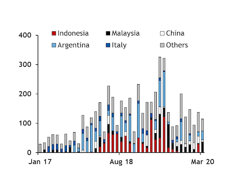 Imports from Indonesia fell sharply, just 30,000t in the first three months of this year from 160,000t in January-March 2019, a result of the EU's imposition of anti-subsidy duties (ASDs) in August (see chart). Other suppliers have moved to fill the gap: imports from China rose to 55,000t from 40,000t; imports from Malaysia rose to 55,000t from 15,000t.