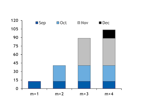 Time spreads in the main delivered markets may be wide enough to cover the additional costs to store LNG cargoes at sea for deliveries into the fourth quarter. The Dutch TTF August-November spread would be sufficient to cover additional shipping costs for up to approximately 89 days, based on Argus forward charter rates for tri-fuel diesel-electric (TFDE) vessels, boil-off of 0.1pc per day and average cargo size of 165,000m³. Similarly, the September-December spreads may cover additional shipping costs for up to 91 days.