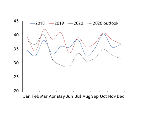 Indonesian coal exports for the full year could decline by as much as 50mn-60mn t against last year to 394mn-404mn t, the association said. This means that monthly shipments to the seaborne market will likely fall short of 2018 and 2019 throughout the remainder of this year (see chart).