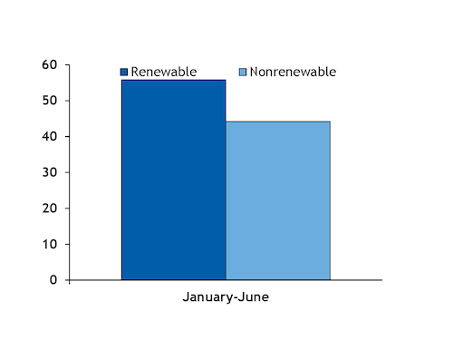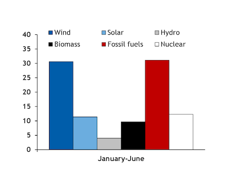 Output from wind, solar, hydropower and biomass plants totalled 136.4TWh in January-June, compared with 76.19TWh from fossil fuel-fired facilities, data from research institute Fraunhofer ISE show. These data include power plants with capacity of below 100MW, as well as embedded renewable sites. Overall, non-renewable sites — including nuclear — produced a total of 108.10TWh and accounted for 44.2pc of the generation mix.