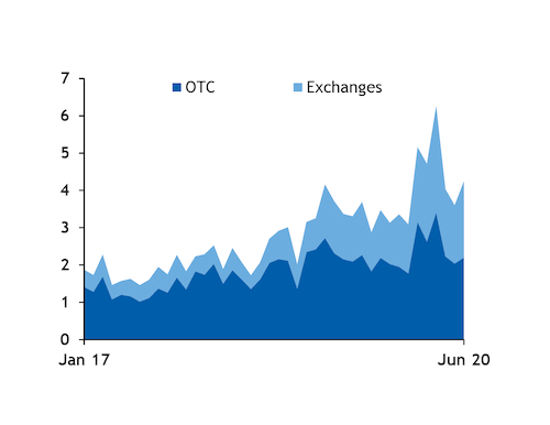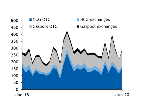 The exchanges have gradually gained share over OTC products in the European gas market in recent years, particularly at the UK's NBP. OTC trades accounted for just 51.8pc of aggregate TTF traded volumes in June, down from 63.4pc a year earlier and the lowest share for any month. This was still well above the 33.5pc of OTC market share at the NBP.