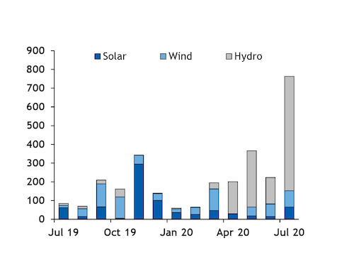 Renewable capacity expanded by 769MW last month, against 228MW in June and just 89MW a year earlier. This was also much faster than unit additions in the first half of this year, which averaged 190MW/month (see chart).