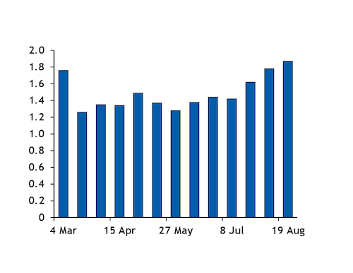 The EU's practice of halving volumes tends to overcompensate for the fall in demand over the period, and a similar effect has also been seen in EU-wide auctions this month. Bid-to-cover ratios in such sales have averaged 2.06 in August, putting them on track for their highest monthly average since February.