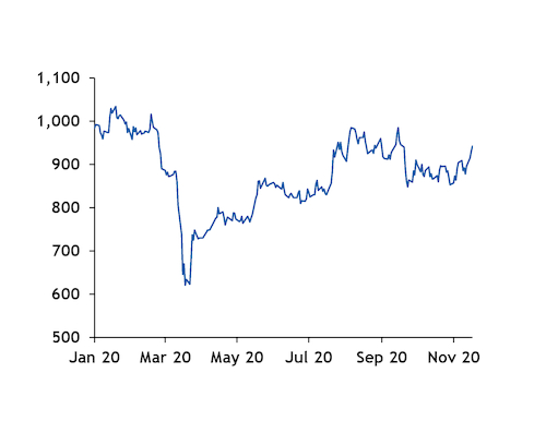 Platinum prices have recovered since their 2020 low of $621/troy ounce (toz) on 21 March, according to UK speciality chemical producer Johnson Matthey. Prices stood at $942/toz on 18 November, reflecting limited availability and increased demand.