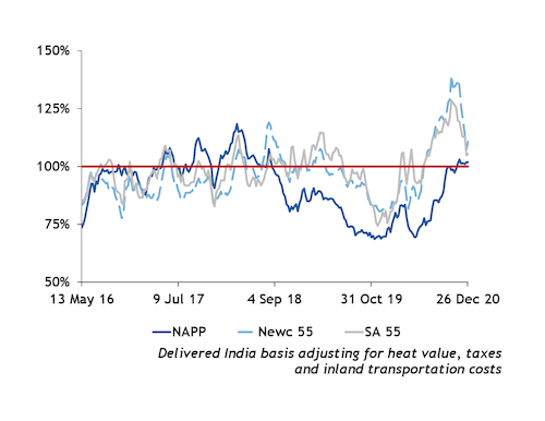 Any downside movement would widen coke's premium even further — assuming that coke prices remain firm. Buyers argue that coke prices will have to come down to preserve demand, as many cement makers have switched kilns to coal. India's coke demand is likely to be significantly lower in the first quarter than in the first quarter of 2020. Even some Latin American cement makers are now taking steps to switch the majority of their kilns to coal.