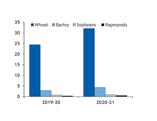 Russia exported 1.6mn t of wheat over the week, taking total exports since the start of the marketing year in July to 32.1mn t, around 31pc higher than a year earlier, according to data from its veterinary and phytosanitary surveillance service.