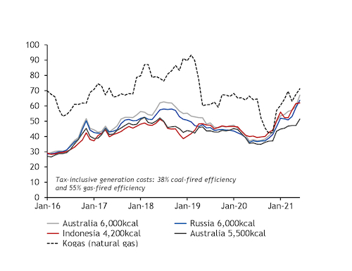 Greater capacity constraints across the coal fleet has also been a headwind in 2021. Around 13.6GW of state-owned Kepco coal capacity was restricted in May according to KPX data, from 10.8GW a year earlier.