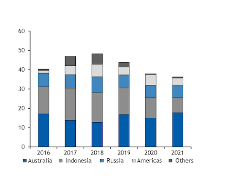 Most of the decline in May was driven by weaker flows from Indonesia and Russia, which is likely to be at least partly as a consequence of firm Chinese demand as buyers seek non-Australian alternatives because of Beijing's informal ban on imports from Australia.