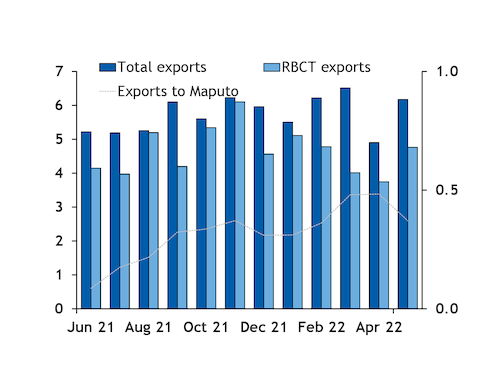 South African exports to Mozambique rose by 258pc between January and May to 2.9mn t in 2022, customs data show (see chart).