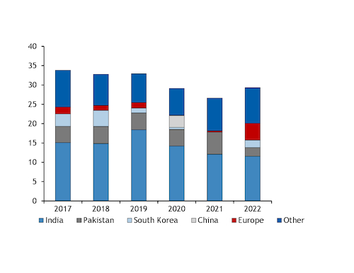 The increase in May was driven by a sharp rise in exports to Europe. Total exports to the continent reached 1.26mn t in May, down by 15pc on the month but up nearly four-fold from May 2021.