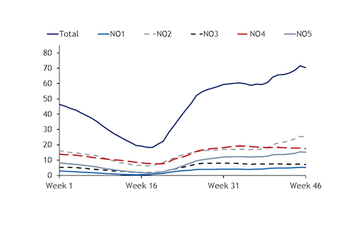 Norwegian hydro reservoir stocks rose to 70.28TWh in week 46 of this year, although down slightly from the yearly high of 71.54TWh recorded in the previous week (see chart). And stocks in southern Norway — in the NO1 bidding zone — have increased sharply to 5.22TWh from 4.12TWh in week 38, when Statnett had started assessing the power situation through its SAKS measures.
