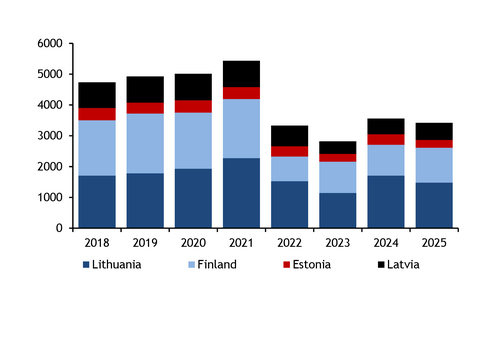 Aggregate consumption in Finland, Estonia, Latvia and Lithuania in April fell to 3.42TWh, down from 3.56TWh the previous year and the three-year average of 5.12TWh in 2019-21. That said, it was still higher than in both 2022 and 2023 (see consumption graph).