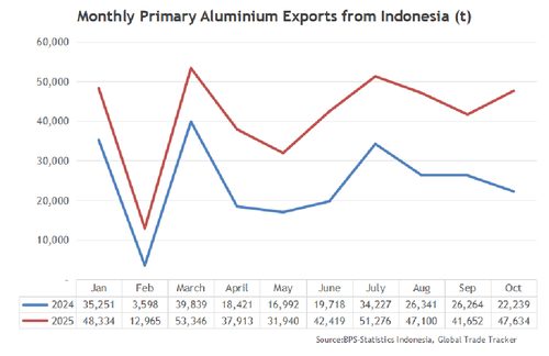 Indonesia's primary aluminium exports rose by 71pc on the year to 414,600t in January–October, from 243,000t in the same period a year earlier. China remained the top destination, taking 191,500t, or 46pc of total volumes. Exports of aluminium value-added products — under HS code 7604, 7605, 7606, 7607, 7608, 7609, 7610 and 7616 — increased by 40pc on the year to around 111,000t in the same period, according to Global Trade Tracker data.