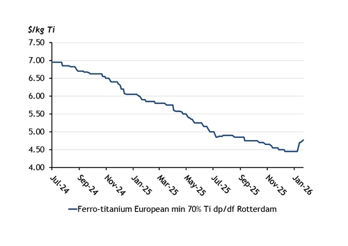Argus assessed European ferro-titanium prices at $4.65-4.90/kg Ti dp/df Rotterdam on 22 January, up by 7pc since 8 January and the highest since 11 September. The increase was supported by a number of factors but some market participants still question the sustainability of the rise based on broader weak demand fundamentals.