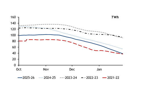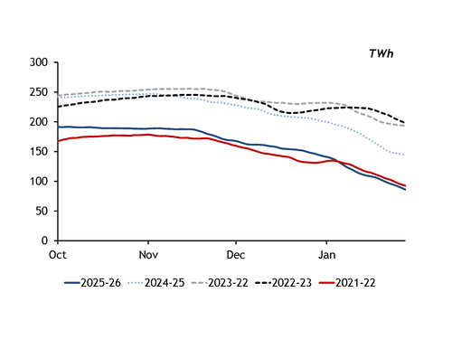 But storage withdrawals may stay high over the remainder of the winter, particularly in the Netherlands. Gasterra plans to fully deplete the 59TWh Norg and 24TWh Grijspkerk sites by 1 April ahead of their handover to operator Nam. The Netherlands' only other large storage site, the 49TWh Bergermeer, held only 15TWh of gas as of 28 January.