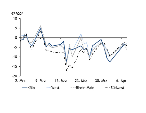 Diese Unsicherheit belastet den Importmarkt. Hohe Importkosten und eine ausgeprägte Backwardation von über 100 $/t wenige Tage vor dem Auslaufen des April-Kontrakts der ICE Gasoil Futures halten Importeure zurück. In einer Backwardation bezahlen Käufer einen Aufschlag für prompte Abholung gegenüber späterer Verladung. In Norddeutschland wurden im April bislang nur begrenzte Volumina aus den Niederlanden und Skandinavien angeliefert. Und auch Importe über den Rhein aus dem Handelszentrum Amsterdam-Rotterdam-Antwerpen (ARA) sind derzeit nicht zuletzt angesichts der hohen Backwardation wenig attraktiv (siehe Grafik). Entsprechend sei die Nachfrage nach Schiffsraum weiter schwach, so Reeder.