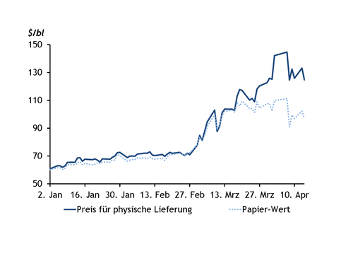 Seit Ende März müssen europäische Käufer aber zunehmend mit asiatischen Käufern um Rohölsorten aus dem Atlantikbecken konkurrieren. Inzwischen steigen deshalb in Europa die Prämien für die Lieferung von physischem Rohöl gegenüber Rohöl-Futureskontrakten deutlich an (siehe Grafik).