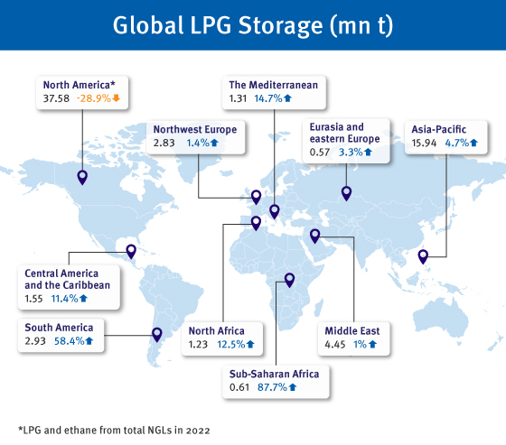 The total number of storage facilities in the survey — with a capacity above approximately 1,000t — now stands at nearly 1,300 with a combined capacity of 68.9mn t, compared with 1,120 plants at 82mn tin 2022. The explanation for the drop in capacity is Argus’ new estimates for US and Canadian storage facilities, broken down into LPG and ethane rather than total natural gas liquids. This puts US LPG and ethane storage capacity at 37.6mn t, down from 52.9mn t, although the number of facilities grows to 115 from 103.