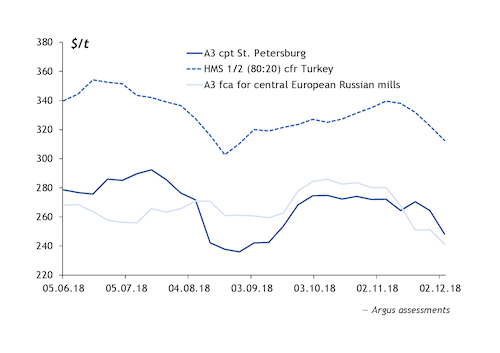 Delivered St Petersburg dock prices for A3 grade scrap have moved more closely in line with fca central European Russian A3 domestic prices since the start of October. Dockside markets in other major ferrous scrap exporting regions increased between 16 October and 13 November in response to a $10.80/t rise in the cfr Turkey HMS 1/2 80:20 price during this period.