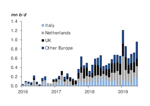 US crude has fast become a staple for Europe's refineries since Washington relaxed export restrictions in late 2015. Nearly 850,000 b/d of US crude loaded to go to Europe in the first half of this year, up from 550,000 b/d in the whole of 2018 and just 300,000 b/d in 2017 (see graph). And those flows are expected to step up further in the year ahead as the expansion of US transportation and loading infrastructure allows for more exports. Nearly 850,000 b/d has loaded to go to Europe so far this month, data from oil analytics firm Vortexa show, and that figure could rise above 1mn b/d in September for only the second time.
