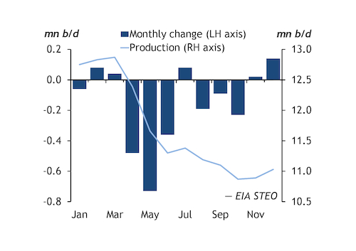 US production will have fallen by nearly 1.6mn b/d over the course of the second quarter, the EIA projects in its latest monthly Short-Term Energy Outlook (see graph). Developers have rapidly cut spending and idled rigs in the face of huge demand declines and a crude price collapse since March. Many upstream independents have withdrawn their production guidance for this year because of the uncertain macroeconomic recovery outlook.