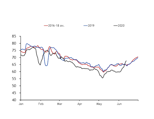 And hot conditions in northeast Asia are likely supporting plant running hours, as peak power demand for cooling has spiked in recent days. Peak daily demand reached as high as 75.3GW this week and averaged 67.6GW over the past seven days, which is above the 64.2GW 2015-19 seasonal average.