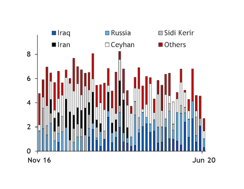 Another two crude cargoes are signalling arrival at Milazzo by 9 July, a 750,000 bl cargo of Baltic Urals and a 700,000 bl shipment of US WTI, according to Argus tracking. This suggests receipts may increase in July from just 90,000 b/d in June, and compared with 145,000 b/d in May, and is likely to be the result of scheduling and Milazzo running crude from storage. Receipts were 155,000 b/d in the first half of 2020, around 65pc of capacity in line with statements from Eni on its refinery throughput.