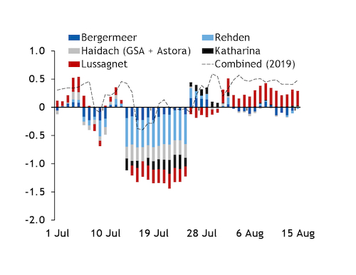 Combined net withdrawals from sites where Gazprom is known to hold capacity, including Germany's Rehden and Katharina, the Netherlands' Bergermeer facility and the firm's capacity at Haidach on the German-Austrian border, were 394GWh/d in July, reversed from net injections of 57.9GWh/d a year earlier. Net withdrawals from the sites have continued since then, at 30GWh/d on 1-15 August versus a net stockbuild of 167GWh/d a year earlier.