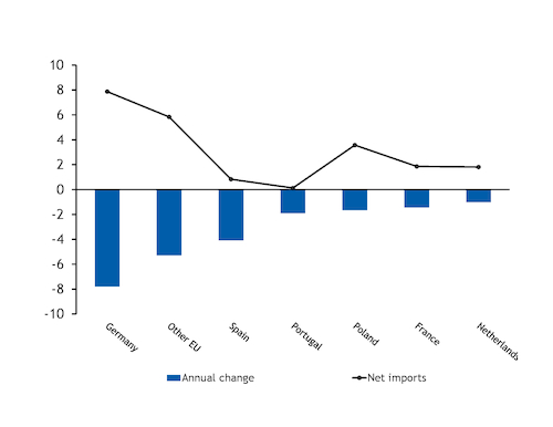 The overall decline in EU-27 imports this year has been driven by Germany, which accounted for a third of the 23.1mn t total reduction. Spain, Portugal and Poland accounted for a further 4.1mn t, 1.9mn t and 1mn t of the decline, respectively.