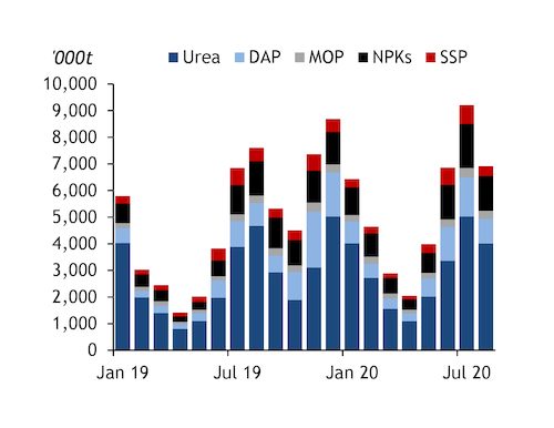 Phosphates-based products remain the key drivers behind sales in India, with DAP and NPK sales at 923,000t and 1.3mn t in August, eclipsing last year's levels. But sales of urea, the most widely consumed fertilizer in India, were 4.01mn t last month, down from 4.67mn t a year earlier.