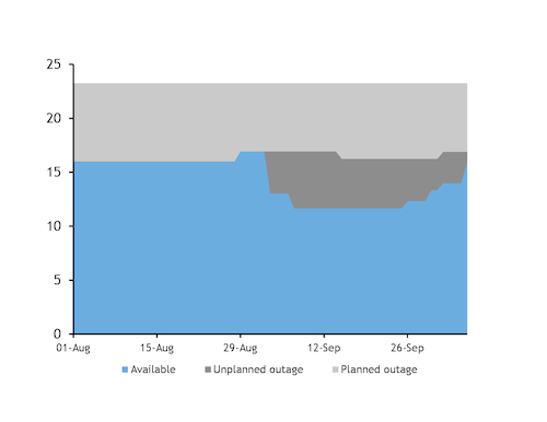 This outlook includes the scheduled return of the 1GW Hanbit 3 reactor on 18 October, although the unit has been off line for several years and has faced numerous delays to its restart, casting some doubt over whether the unit will resume operations this month. Hanbit 4, which has also been off line for over a year, recently had its restart date pushed back by around six months to mid-March 2021.
